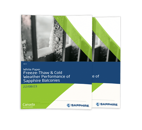 This Whitepaper summarizes an experimental program undertaken by Sapphire and their development partners to assess the balcony system response to snow and ice accumulation – two phenomena that must be expected during Canadian winters. While the tests were not exhaustive, Sapphire has assessed the results and has concluded that the cold weather performance of the system is satisfactory, but would be very happy to engage with further inquiries and discussion with industry bodies as appropriate.